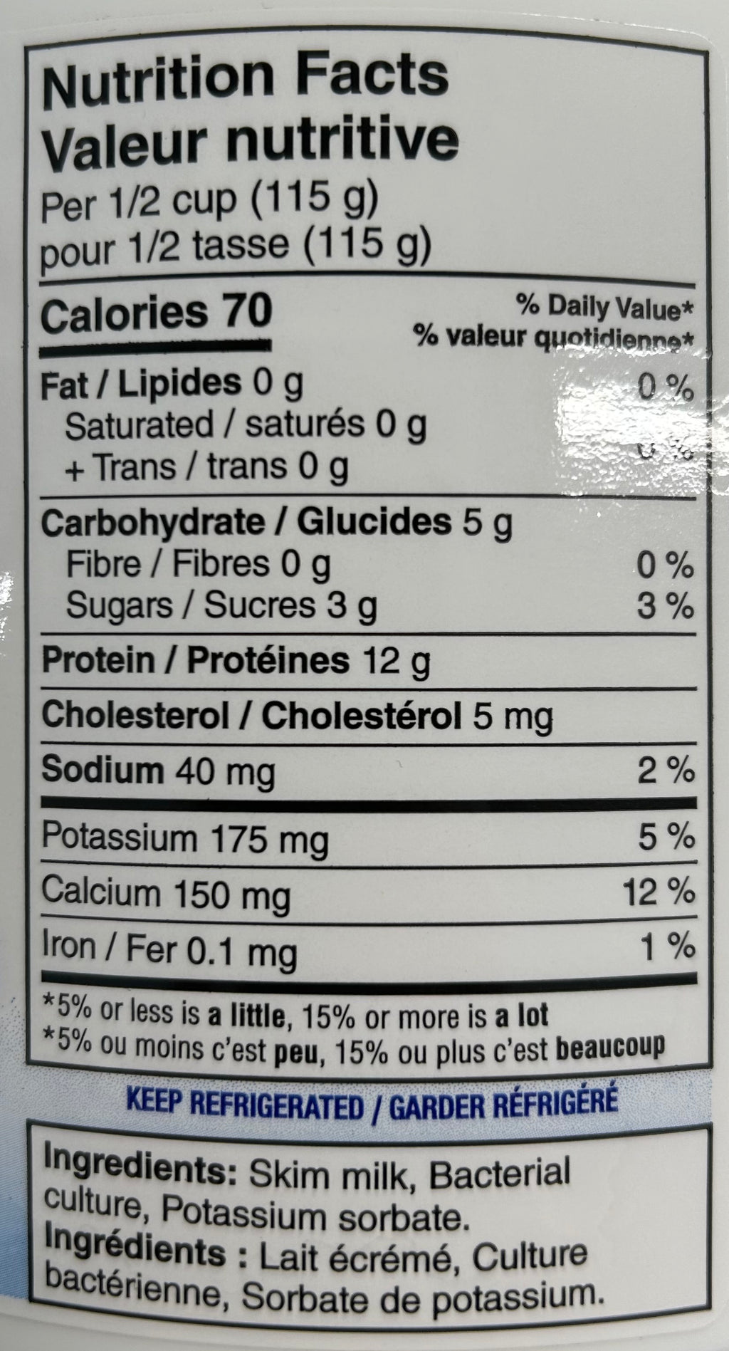 Ingredients: Skim milk, bacterial culture, potassium sorbate. 0% M.F.